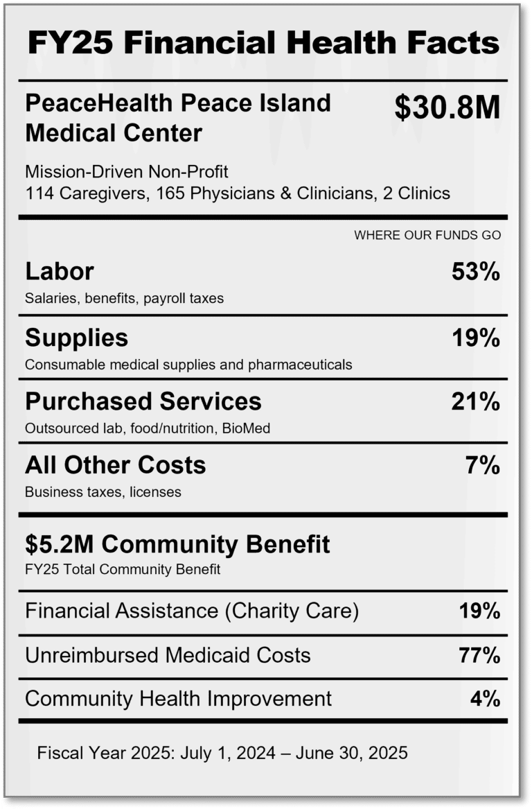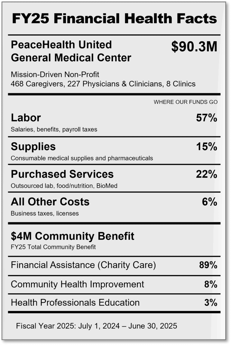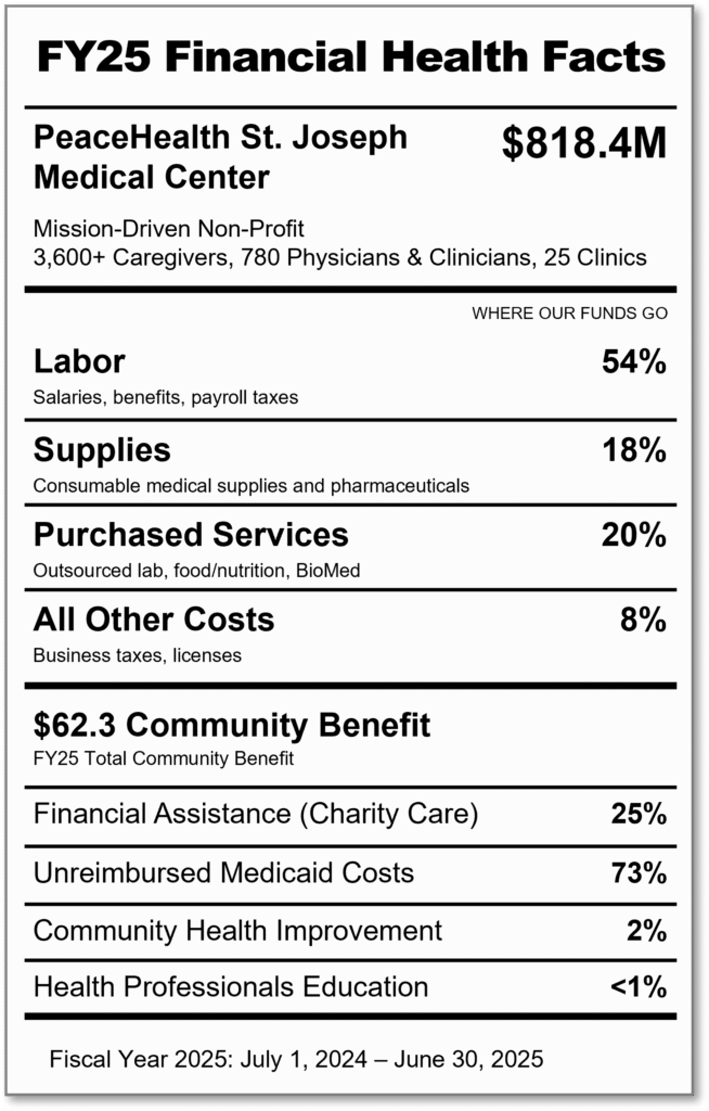 It costs over $818.4 million each year to run PeaceHealth St. Joseph Medical Center and our clinics in Whatcom County. Over half of this amount goes to paying our caregivers, including their salaries, benefits, and payroll taxes — that’s more than $1.2 million a day.